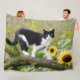 Cute tuxedo cat on a tree branch with sunflowers _ fleece blanket