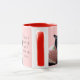 Photo of cute black and white tuxedo cat wearing a pink and white striped dress, with a green bone on it, with the message, When I think of you I think of peace, is printed on two sides of custom mugs. The message can be customized on the template form.