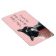 Photo of cute black and white tuxedo cat wearing a pink and white striped dress, with a green bone on it, with the message, When I think of you I think of peace, is printed on flexible magnets. The message can be customized on the template form.