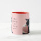 Photo du mignon chat tuxedo noir et blanc vêtu d'une robe rayée rose et blanche, avec un os vert dessus, avec le message, Quand je pense à vous, je pense à la paix, est imprimé sur deux côtés de tasses personnalisées. Le message peut être customisé sur le formulaire modèle.