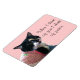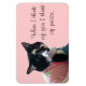 Photo d'un mignon chat en smoking noir et blanc vêtu d'une robe rayée rose et blanche, avec un os vert dessus, avec le message, Quand je pense à vous, je pense à la paix, est imprimé sur des magnets flexibles. Le message peut être customisé sur le formulaire modèle.