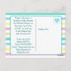 Here are cute hand drawn baby boy and girl twins Baby Shower invitations. Personalize these by adding your party's information in the personalize area. Pink, blue, green, purple and tan stripes in the background with a cute boy and girl baby twin in each corner. These postcard invitations are a very affordable way to get pre made personalized baby shower invitations.