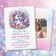 Add your daughter's photo to this cute unicorn and flowers themed purple, pink and blue girl's birthday invitation.