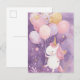 Adorable watercolor birthday card featuring a chubby white unicorn with a pink mane and golden horn, holding pink and gold balloons against a dreamy purple background. Perfect for kids, unicorn lovers, and magical celebrations.
