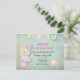 A sweet baby unicorn sits and looks at a butterfly on her nose. Pretty invitations postcard in shades of pink and pale green to invite your guests to your little one’s birthday celebration. Easily customise the text on front and back.