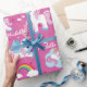 Cute pink unicorn magical design gift wrap featuring cute baby unicorns, clouds, colourful rainbows and stars with dreamy purple and pink background. Specially designed for girls birthday celebrations.