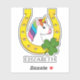 An illustration of a cute white unicorn with rainbow hair on a golden horse shoe with a green shamrock clover leaf for St. Patrick's Day. This beautiful fairytale and magical animal design is a gift idea for whimsical lovers and good luck charm lovers.