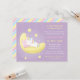 Une invitation sucrée au baby shower sur le thème de la licorne dans les couleurs pastel sur un arrière - plan violet poutre. Le design présente une mignonne petite licorne blanche avec une crinière rouge, jaune et bleue pastel dormant joyeusement sur la lune de croissant. Des cordes d'étoiles regardent la petite créature. Une touche magique et conte de fées pour les mamans qui s'attendent à des petites filles !