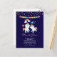 Party thank you postcard with 2 cute dancing unicorns with bright and colourful tails, and mane. A colourful rainbow with clouds on each side above their heads. Other elements include a little flower a heart and some stars. Dark purple background. Colourful confetti dots and a bunting banner image along the top.