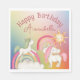 The background is a rainbow gradient pattern. Two cute unicorns are pictured at the top with little rainbows, clouds, and the sun. A sample Happy Birthday message and name are printed in a pretty pink font. You can personalize the napkins to include your own custom name or text.