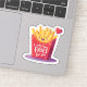 A cute and colorful cartoon illustration of a red French fries carton with a happy kawaii smiling face. The design features a floating red heart and the romantic funny pun quote "I only have FRIES for you". The image has a white sticker border, making it perfect for Valentine's Day greeting cards, fast food lovers, and humorous romantic gifts. Isolated design.
