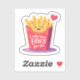 A cute and colorful cartoon illustration of a red French fries carton with a happy kawaii smiling face. The design features a floating red heart and the romantic funny pun quote "I only have FRIES for you". The image has a white sticker border, making it perfect for Valentine's Day greeting cards, fast food lovers, and humorous romantic gifts. Isolated design.