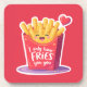 A cute and colorful cartoon illustration of a red French fries carton with a happy kawaii smiling face. The design features a floating red heart and the romantic funny pun quote "I only have FRIES for you". The image has a white sticker border, making it perfect for Valentine's Day greeting cards, fast food lovers, and humorous romantic gifts. Isolated design.