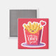A cute and colorful cartoon illustration of a red French fries carton with a happy kawaii smiling face. The design features a floating red heart and the romantic funny pun quote "I only have FRIES for you". The image has a white sticker border, making it perfect for Valentine's Day greeting cards, fast food lovers, and humorous romantic gifts. Isolated design.