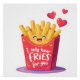 A cute and colorful cartoon illustration of a red French fries carton with a happy kawaii smiling face. The design features a floating red heart and the romantic funny pun quote "I only have FRIES for you". The image has a white sticker border, making it perfect for Valentine's Day greeting cards, fast food lovers, and humorous romantic gifts. Isolated design.