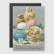 Three adorable yellow vintage chicks in a glass bowl with coloured Easter eggs.