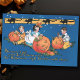 Lovingly restored vintage illustration featuring three cute children carving Halloween jack-o-lanterns under a dark blue starry sky with a band of black cats marching overhead with spooky cautionary text. Suitable for decoupage or Fall crafting projects.
