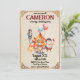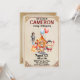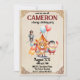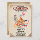 This party invitation features a vintage circus theme. The background is a rustic parchment paper pattern with an antique frame. An illustrated image of a vintage Big Top tent, a strong man, and circus animals are placed in the centre. A monkey is pictured balancing on a stack of balls, with a cute lion next to it.