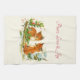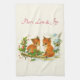 Kitchen towel with a delightful drawing of a pair of foxes with a friendly bird nearby. Surrounded by holly and pine cones and other winter foliage. text (you can change) says Peace, Love & Joy.