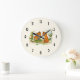 A clock with a delightful drawing of a pair of foxes with a friendly bird nearby. Surrounded by holly and pine cones and other winter foliage.