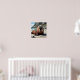 Walrus themed poster wall art. A cute walrus laying on a sandy beach by the ocean on a sunny day. Background of cliffs and blue ocean waves.