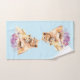 Towel set with a cute watercolor painting of a mother lion holding her baby cub. A pretty purple floral bouquet below them, adds a gentle touch to this sweet and adorable image. Light blue background.