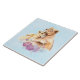 Ceramic tile with a cute watercolor painting of a mother lion holding her baby cub. A pretty purple floral bouquet below them, adds a gentle touch to this sweet and adorable image. Light blue background.