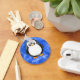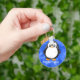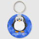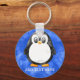 A cute black and white penguin drawing. Baby animal key chains. Blue watercolor background. Edit text to customize. Gift idea for kids.