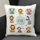 This adorable personalized throw pillow features a charming collection of sketched animal-themed doodles featuring lions, zebras, elephants and monkeys. It is designed with soft, rounded lines and pastel backgrounds in mint green, baby pink, powder blue, and pale yellow.