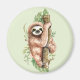 A magnet with a cute watercolor design featuring a cute sloth hanging onto a tree branch surrounded by green tropical leaves.