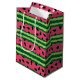 A gift bag with a cute watermelon pattern. Green rind in layers of stripes along with a layer of pink stripes with black seeds inside.