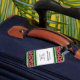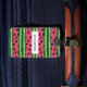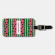 A luggage tag with a cute watermelon pattern. Green rind in layers of stripes along with a layer of pink stripes with black seeds inside.