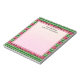 A notepad with a cute watermelon pattern. Green rind in layers of stripes along with a layer of pink stripes with black seeds inside.