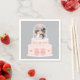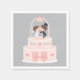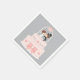 A cute illustration of a wedding cake with ribbon and hearts with a bride in white dress and groom in black top hat and suit under a wedding bells floral archway. Personalize the napkins with the names of the wedding couple and the wedding date! Colour palette of mostly pink.