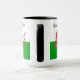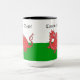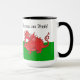 Une tasse blanche avec une jante et une poignée noires et un dragon gallois rouge mignon et "Wales Forever" en gallois, en lettres noires, que vous pouvez changer ou supprimer si vous le souhaitez ; à partir d'une illustration peinte à la main par Judy Adamson.