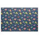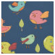 Fabric with a pattern of hand-drawn whimsical birds. Cute little green pine trees between them. Dark blue background.