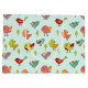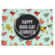 Birthday gift bag, large sized. Designed with a pattern of hand-drawn whimsical birds. Cute little green pine trees between them. A black circle layered over top, on the front, with your personalized text inside.