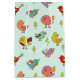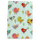 A gift bag with a pattern of hand-drawn whimsical birds. Cute little green pine trees between them.