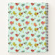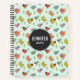 A notebook with a pattern of hand-drawn whimsical birds. Cute little green pine trees between them. A black circle layered over top wuth your name and tite/subject inside.