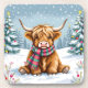 This cute Christmas seasonal coaster that has an ai watercolor style illustration of a baby Highland Cow sitting in a whimsical snowy field during a winter day with a backdrop of holiday decorated pine trees.