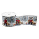 Super cute Christmas ribbon that has an ai watercolor style illustration of a festive racoon sitting in a whimsical snowy forest during a winter day with a backdrop of holiday decorated pine trees.