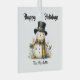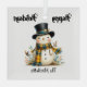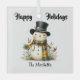 The design on this ornament is a whimsical, smiling snowman with a black top hat and a cheery yellow and blue plaid scarf. He is surrounded by foliage and birds.
