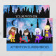 There are four Superheros against a SKYLINE CITYSCAPE. The sky in Watercolor Textured TURQUOISE BLUE HOT PINK PURPLE SKY..