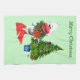 A cute and happy white cartoon duck wears a holly wreath and shows off his decorated Christmas tree.
