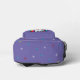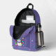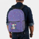 Adorable backpack featuring a cute, whimsical, white cartoon kitty cat with big blue eyes, pink ears and wearing a bright colourful collar. She has a cute blue, pink and white striped tail and a blue stripe on her head. The background is mostly purple with planets, clouds, stars and flowers in a mix of bold, bright, vibrant colours. Ideal for anyone who loves cats and space.