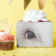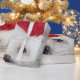 Wrapping paper with an adorable photo of a cute white doggy wearing a red christmas hat.