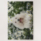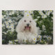 Cute White Dog Sitting Spring White Flower Garden Jigsaw Puzzle