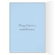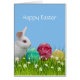 Cute white Easter bunny with painted eggs and flowers on light blue Card. Text can be personalized for Easter or Birthday. Bunnies symbolize longevity, abundance and good fortune.