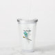 This acrylic drink tumbler with straw and lid has a cute white fancy ghost with blue eyes wearing a blue top hat with gold ribbon and holding a black cane with a golden skull on top. Customise your text with the template on the front and back.