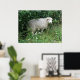 This beautiful print features a photograph of a cute fluffy sheep. The sheep is surrounded by wild flowers and long grass and is eating some leaves. It has a thick white coat of wool and a cute black nose.